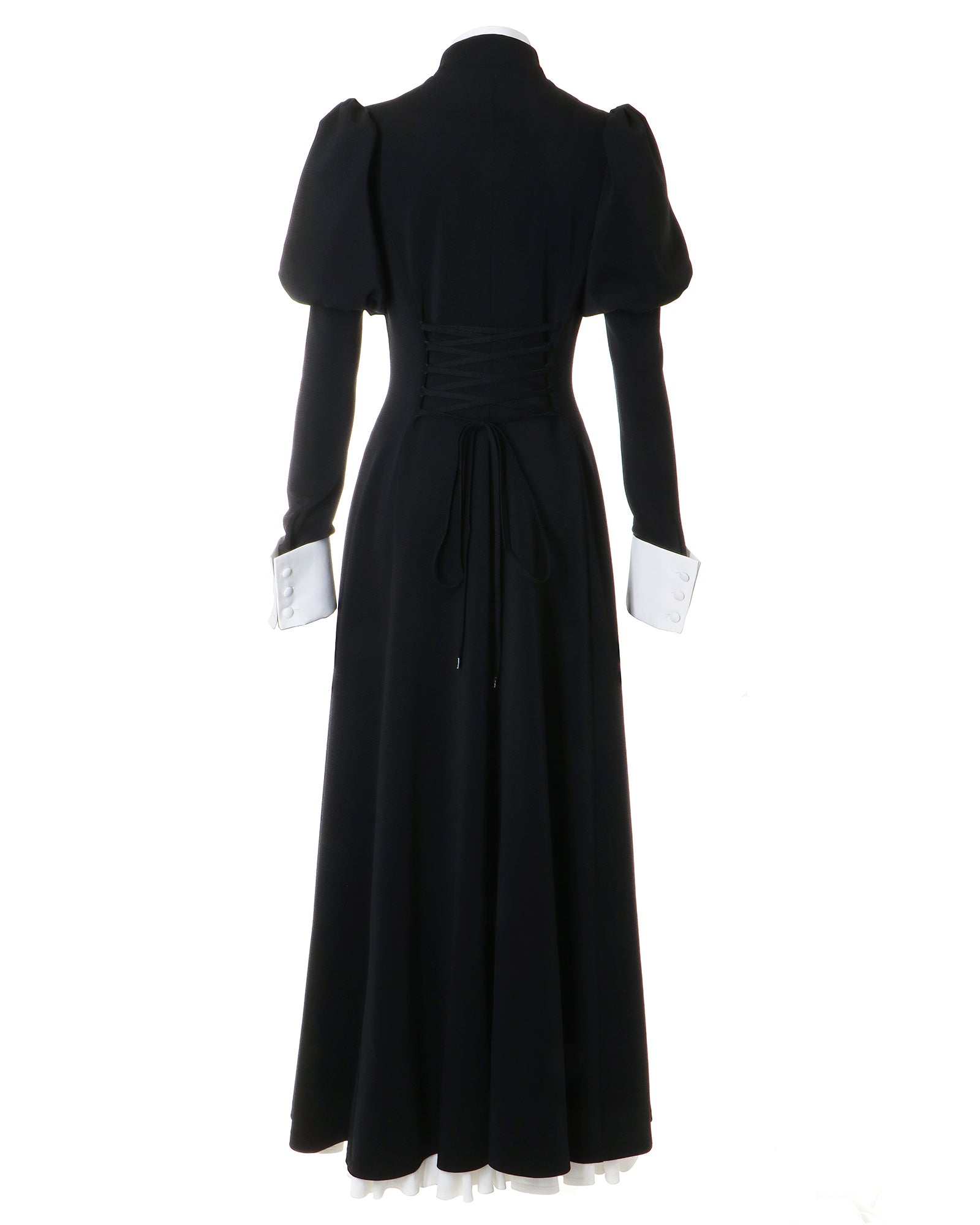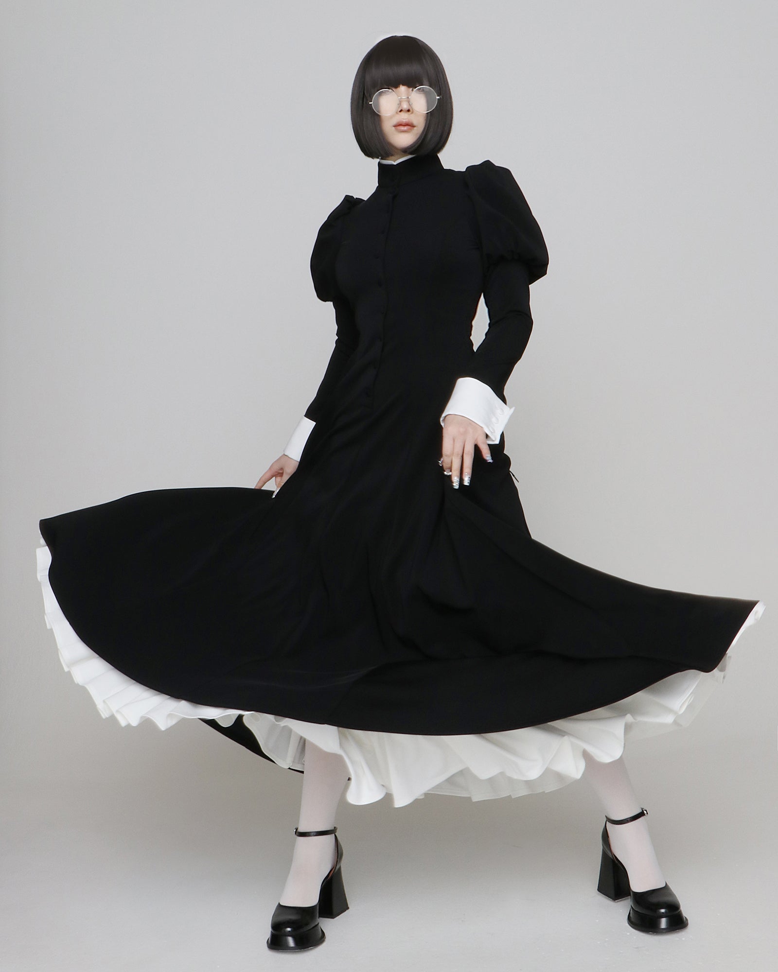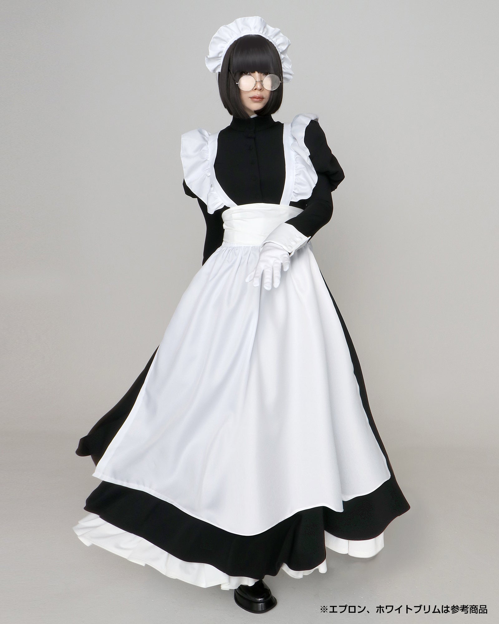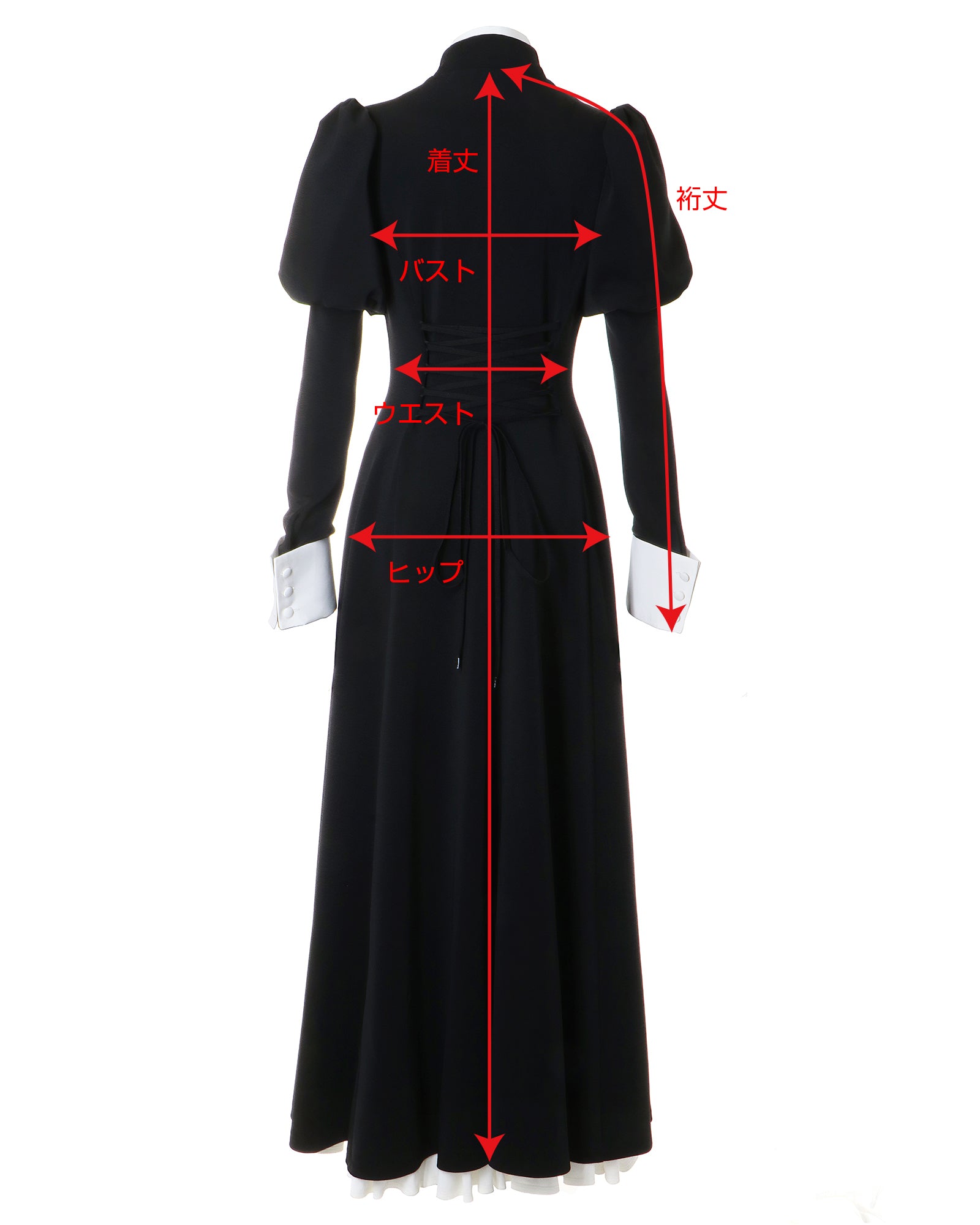 最重装備のメイドユニフォームスタイル。マキシ丈ワンピースでフロントボタンオープン。パフスリーブに3つ釦ホワイトカフス。禁欲的な詰襟にホワイトカラー。カフス、カラーは取り外し可能で、黒装スタイルで着用もできます。奉仕と貞節を極める重鎮重装メイドでありながら抑圧された狂気を内に秘めるメイド『キル(殺)』。