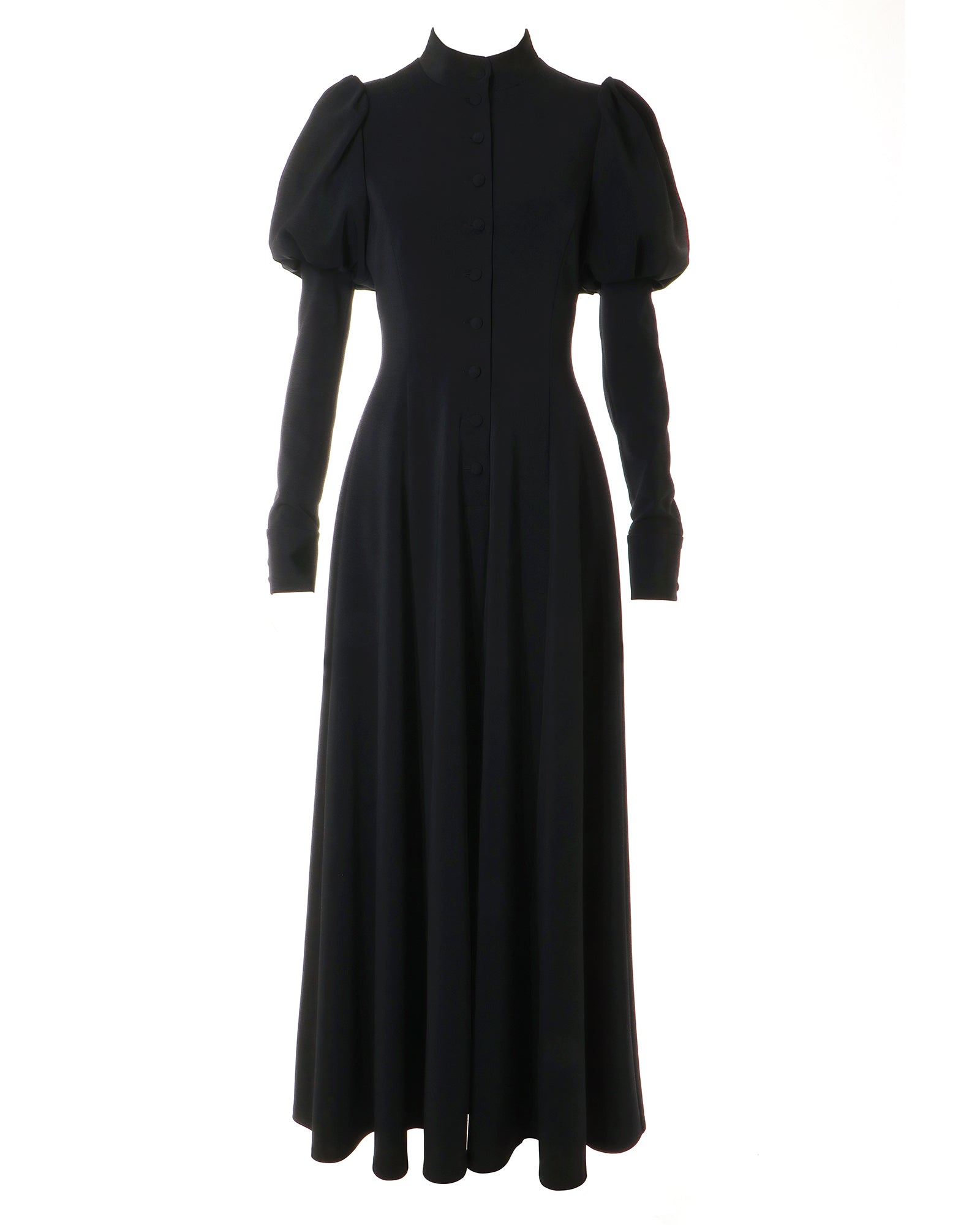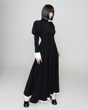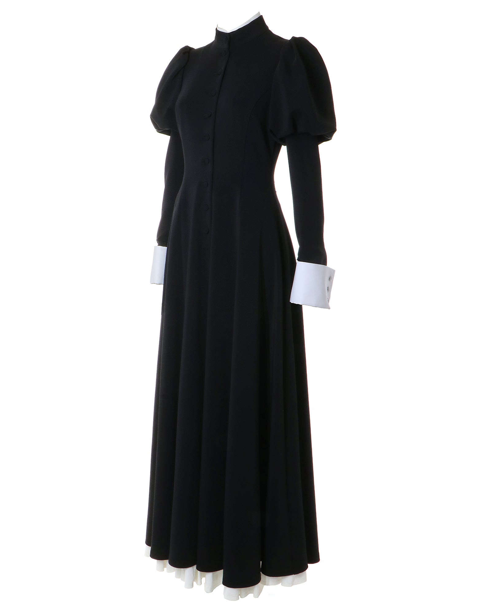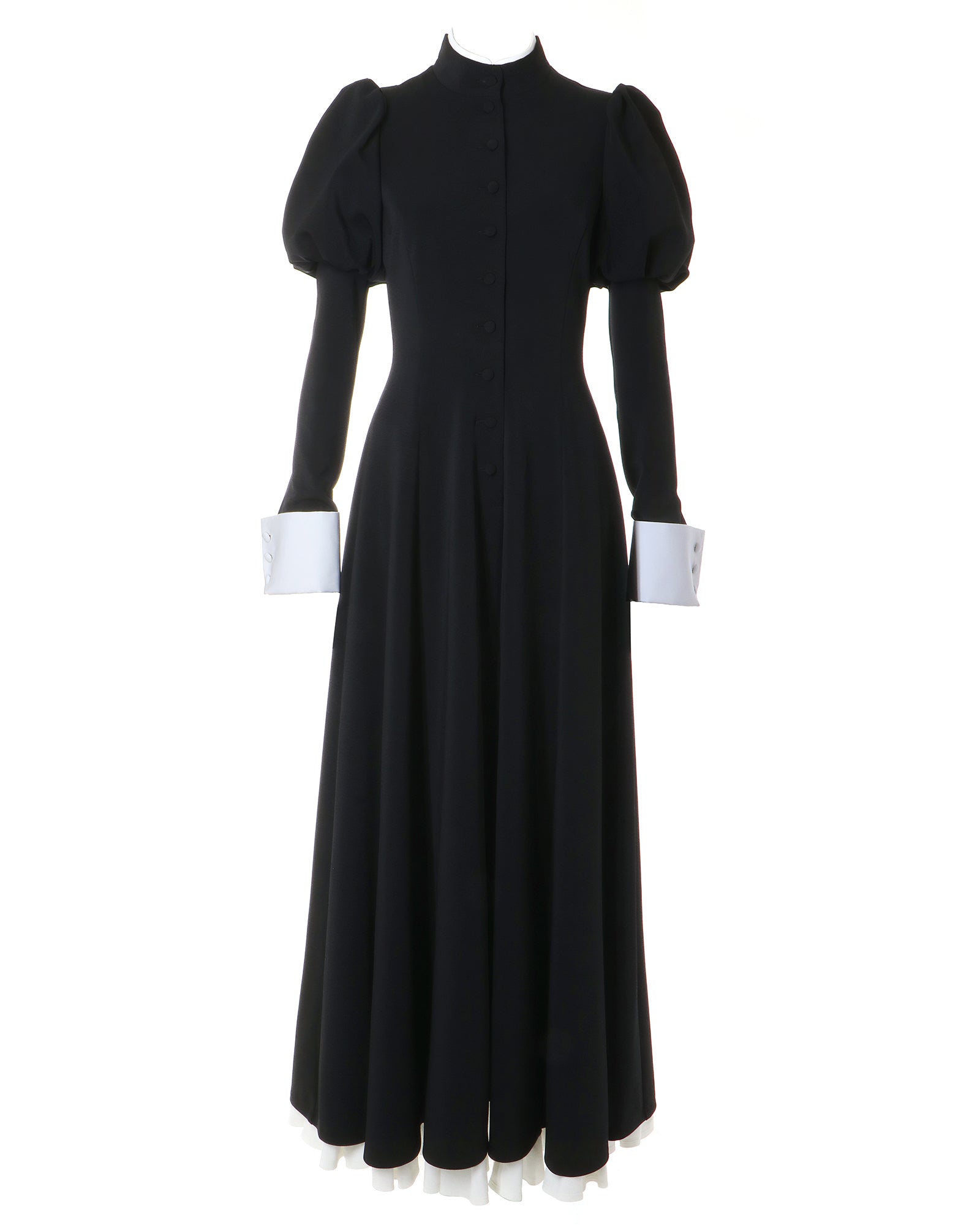 最重装備のメイドユニフォームスタイル。マキシ丈ワンピースでフロントボタンオープン。パフスリーブに3つ釦ホワイトカフス。禁欲的な詰襟にホワイトカラー。カフス、カラーは取り外し可能で、黒装スタイルで着用もできます。奉仕と貞節を極める重鎮重装メイドでありながら抑圧された狂気を内に秘めるメイド『キル(殺)』。
